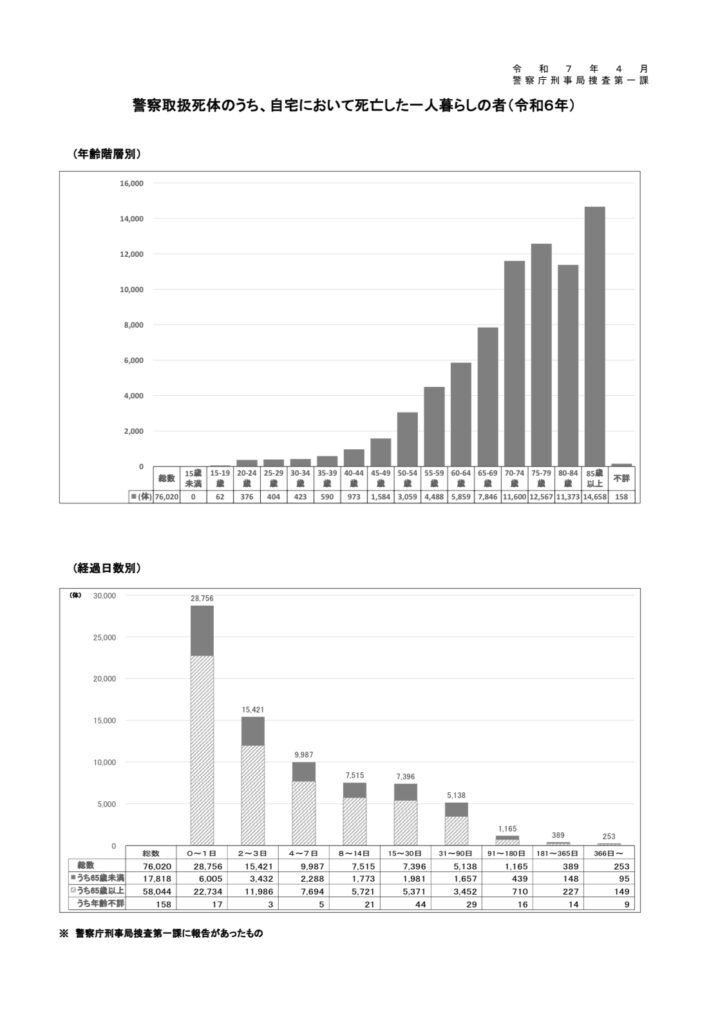 同じ統計では、死亡からの経過日数も集計されています(0~1日、2~3日、4~7日、8日以上など)。(出典:警察庁「警察取扱死体のうち、自宅において死亡した一人暮らしの者(令和6年)」)