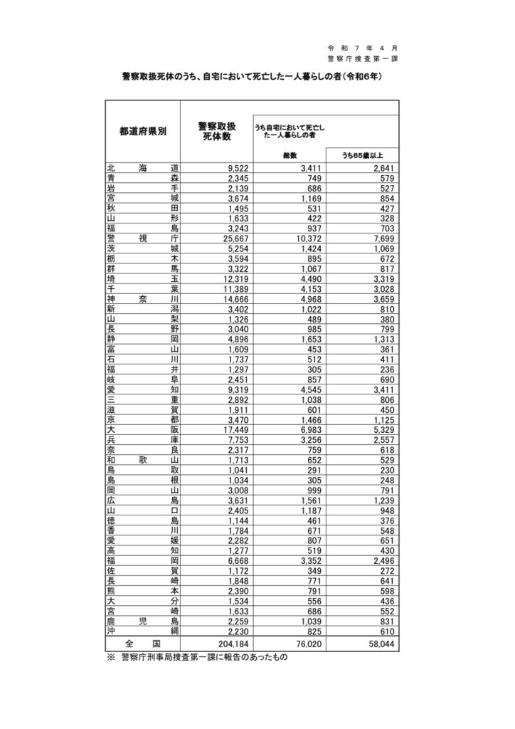 警察庁の公表によると、令和6年中の警察取扱死体は204,184体で、そのうち「自宅において死亡した一人暮らしの者」は76,020体(37.2%)でした。(出典:警察庁「令和6年中における警察取扱死体のうち、自宅において死亡した一人暮らしの者について」)
